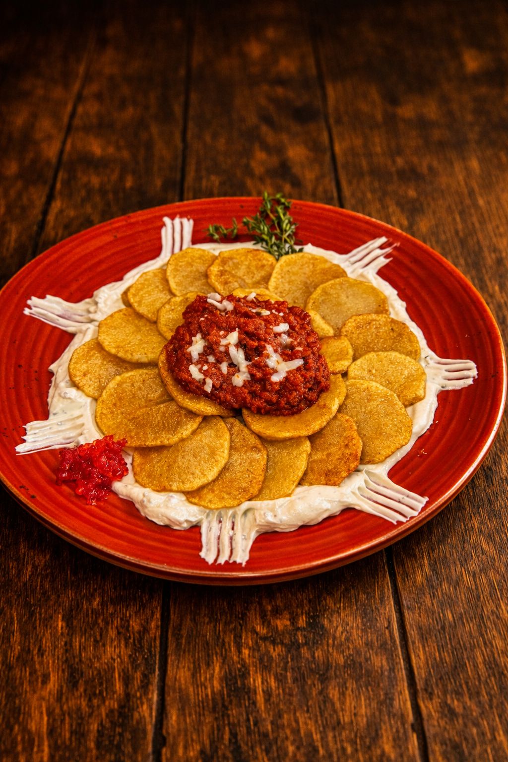 Taze patates, yoğurt sos ve napoliten sos eşliğinde