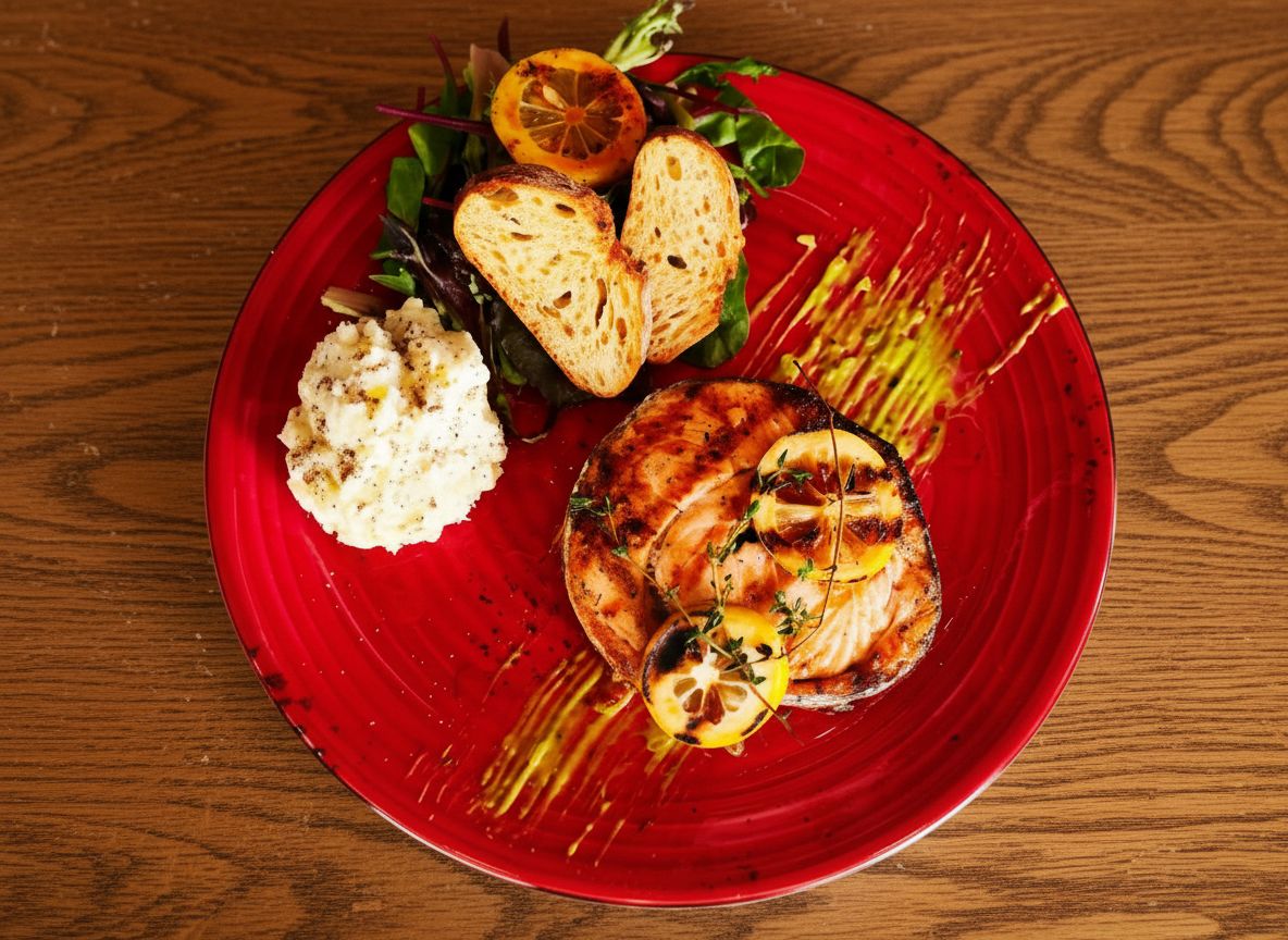 ızgara somon, özel püre, nachos ekmeği, akdeniz salata ile
