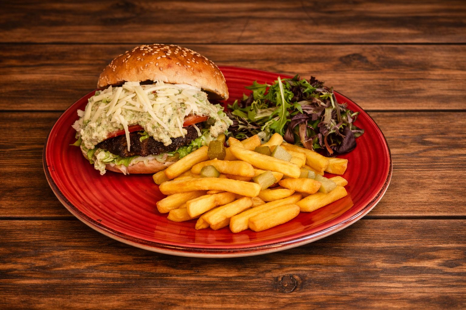 hamburger ekmeği, kaburga köfte, avokado sos, patates, yeşillik ile