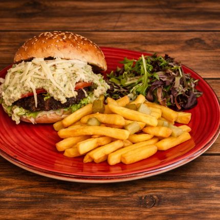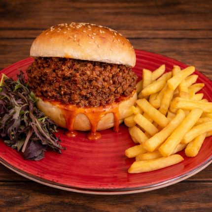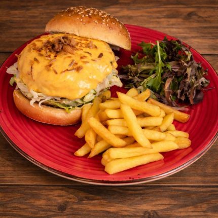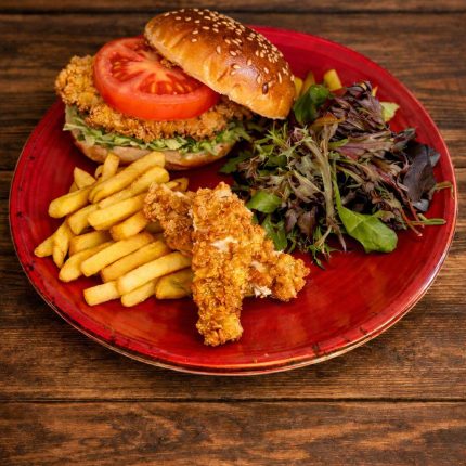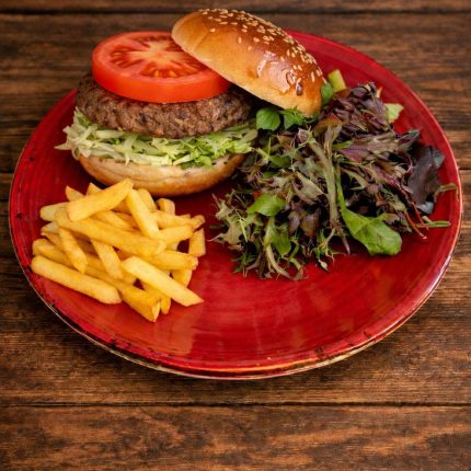 hamburger ekmeği, köfte, burger sos, marul, domates, yumurta,patates, yeşillik ile