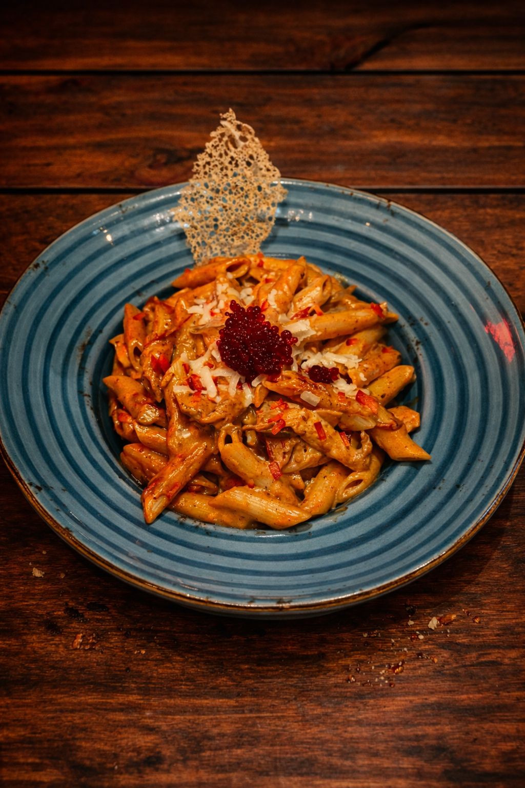 penne makarna, kapya biber, yeşil biber, mantar, acı sos, özel baharatlar ile