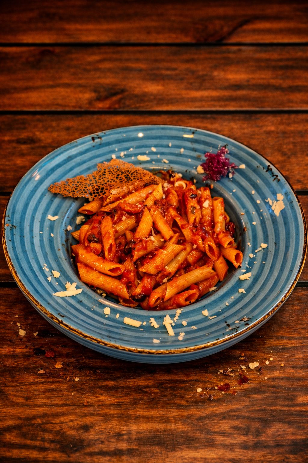 Penne makarna, napolitan sos, permasan peyniri, üzerine tulum peyniri ile