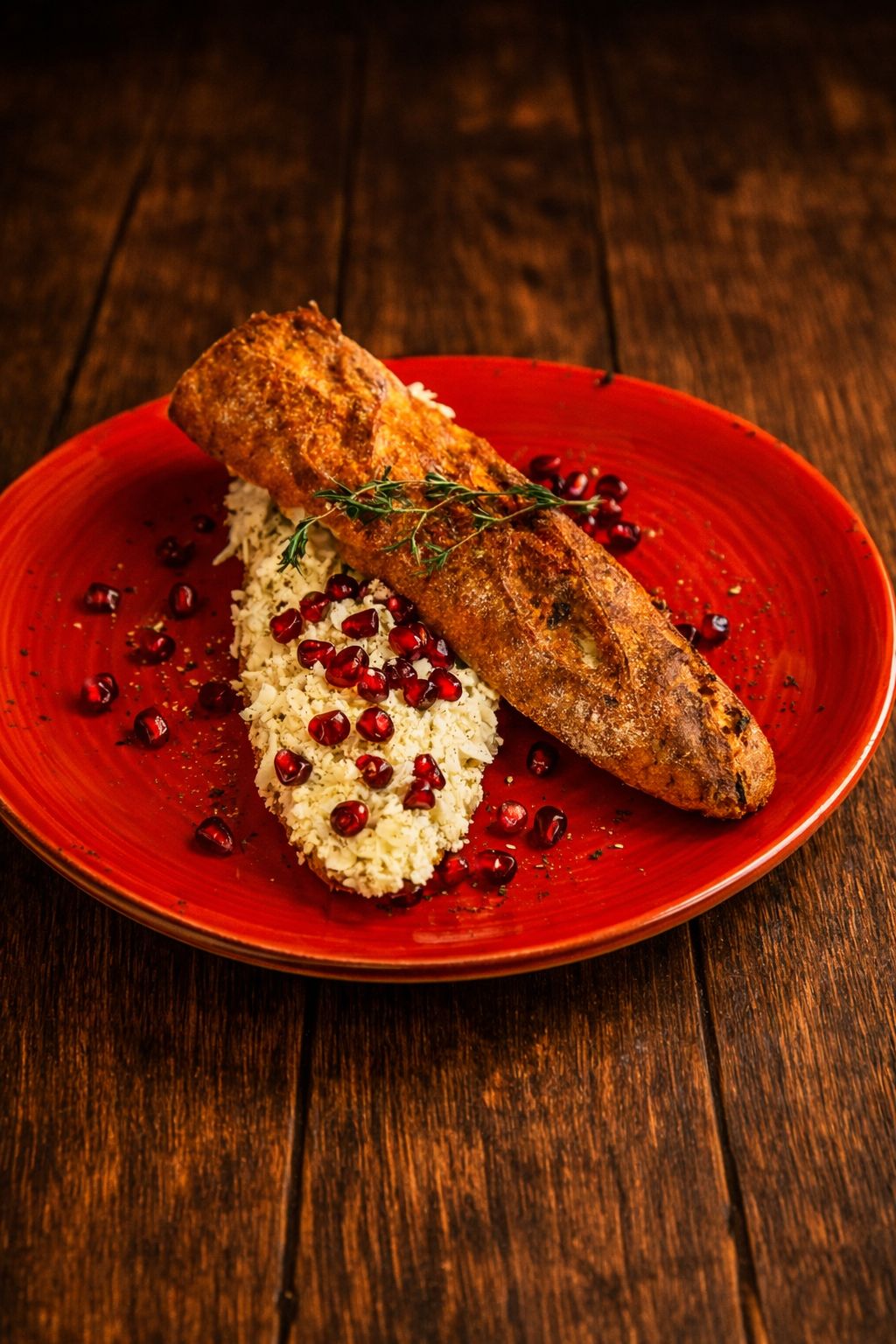 nacho ekmeği içerisine, avokado püresi, nar taneleri, tulum peyniri, kekik ile