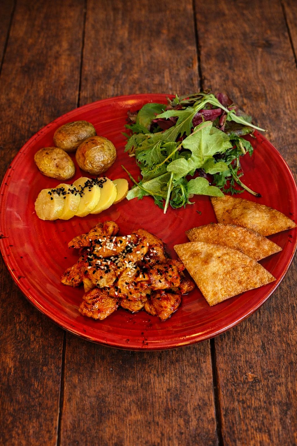 200gr tavuk göğüs, özel ballı acılı sosu, patates, ege yeşillikleri ile